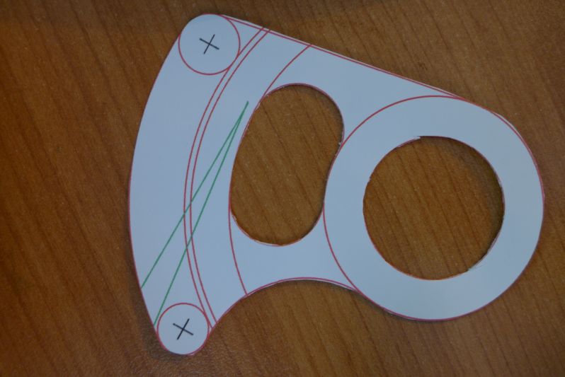 I printed the design on some cardboard and made a cardboard mock-up of the inner plate. Using this, I could make sure things would work as expected before cutting the carbon fibre sheet. The two green lines show the chain angle between the 36t and the 9t rear sprockets.