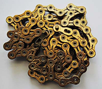 One such chain is the KMC X10SL super lightweight chain. It features a gold coloured Titanium Nitride ("Ti-N") coating that is supposed to make the chain less susceptible to dirt and easier to clean. The chain also has hollow pins and material removed from the side plates to save weight.