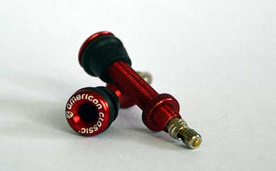 These little guys are lighter and cheaper than the Stans tubeless valve stems. They have removable valve cores and weigh only 3g each. They work well on Podium MMX rims with Stans yellow tape. The large o-ring on the stem is soft enough to conform to the curved inner profile of the Podium MMX rim. This inner profile is the same as the Crest rims so they should work equally well with those rims.